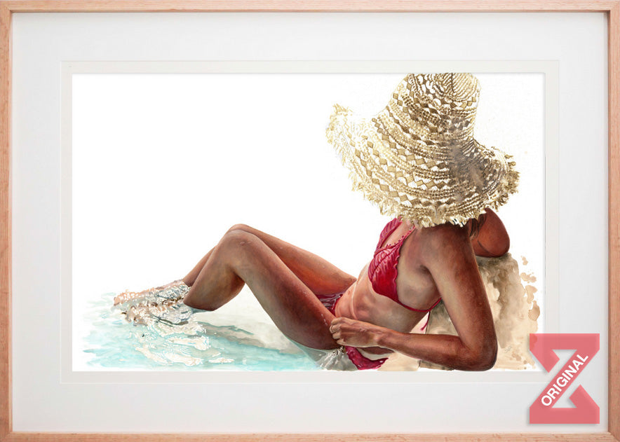 Unveil the allure of the "Azure Escape" as an elegant muse, adorned with a brim hat, surrenders to the embrace of the ocean's azure depths. Holiday vibes intertwine, beckoning to a world of tranquil escape and sun-kissed delight.