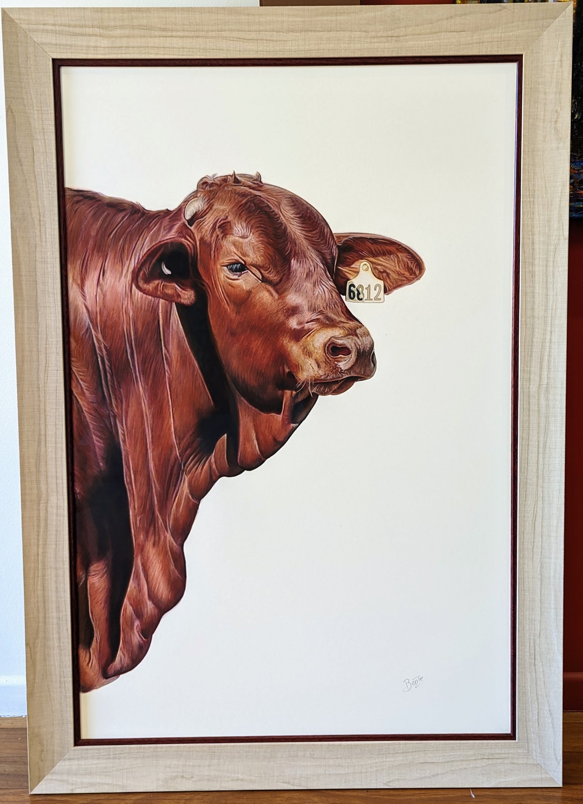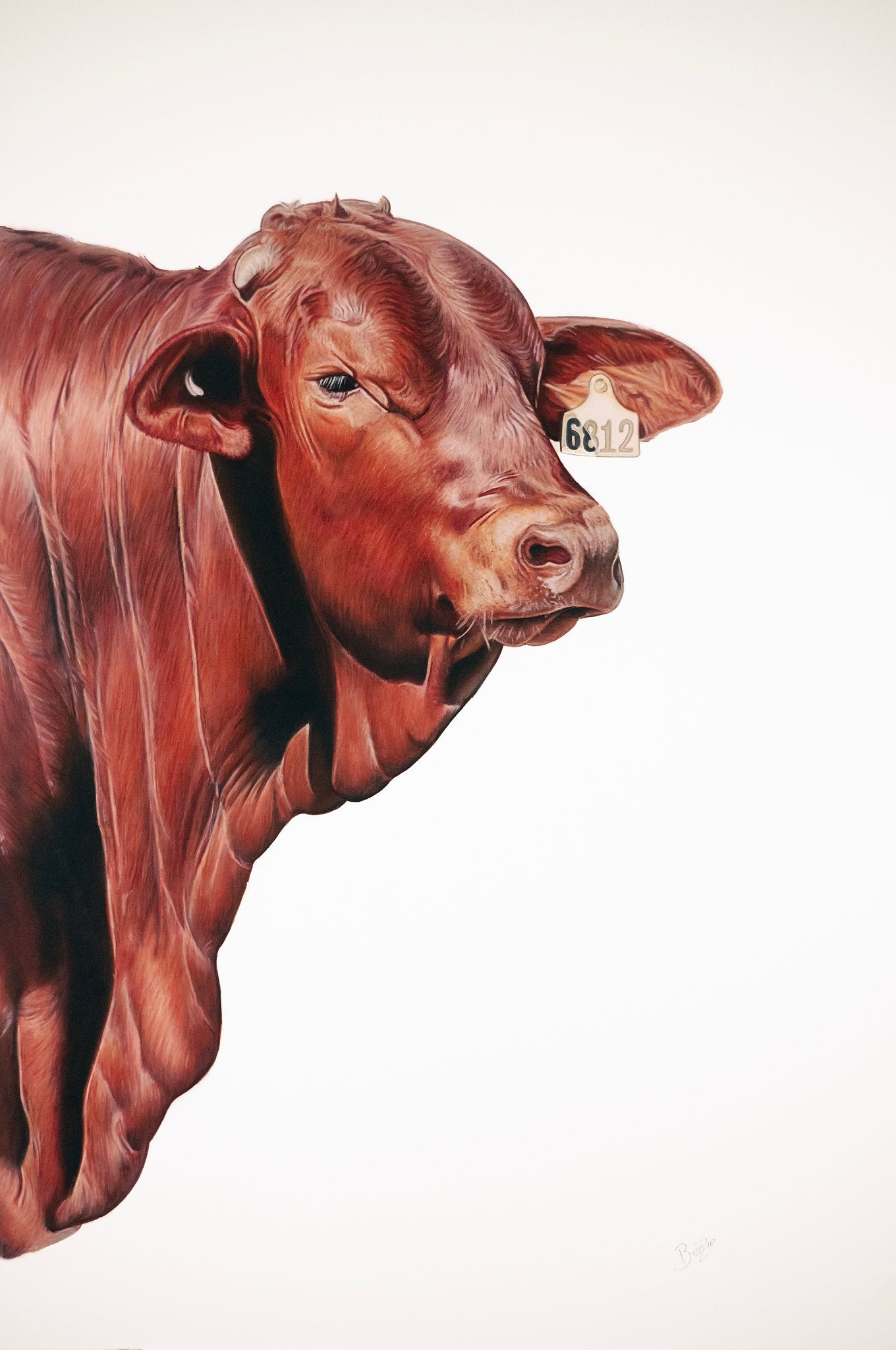 Behold the majestic presence of "Beratta", a striking depiction of the large bull exuding strength and vitality against a stark white backdrop. The bull's formidable form and commanding gaze embody the essence of raw power and resilience.