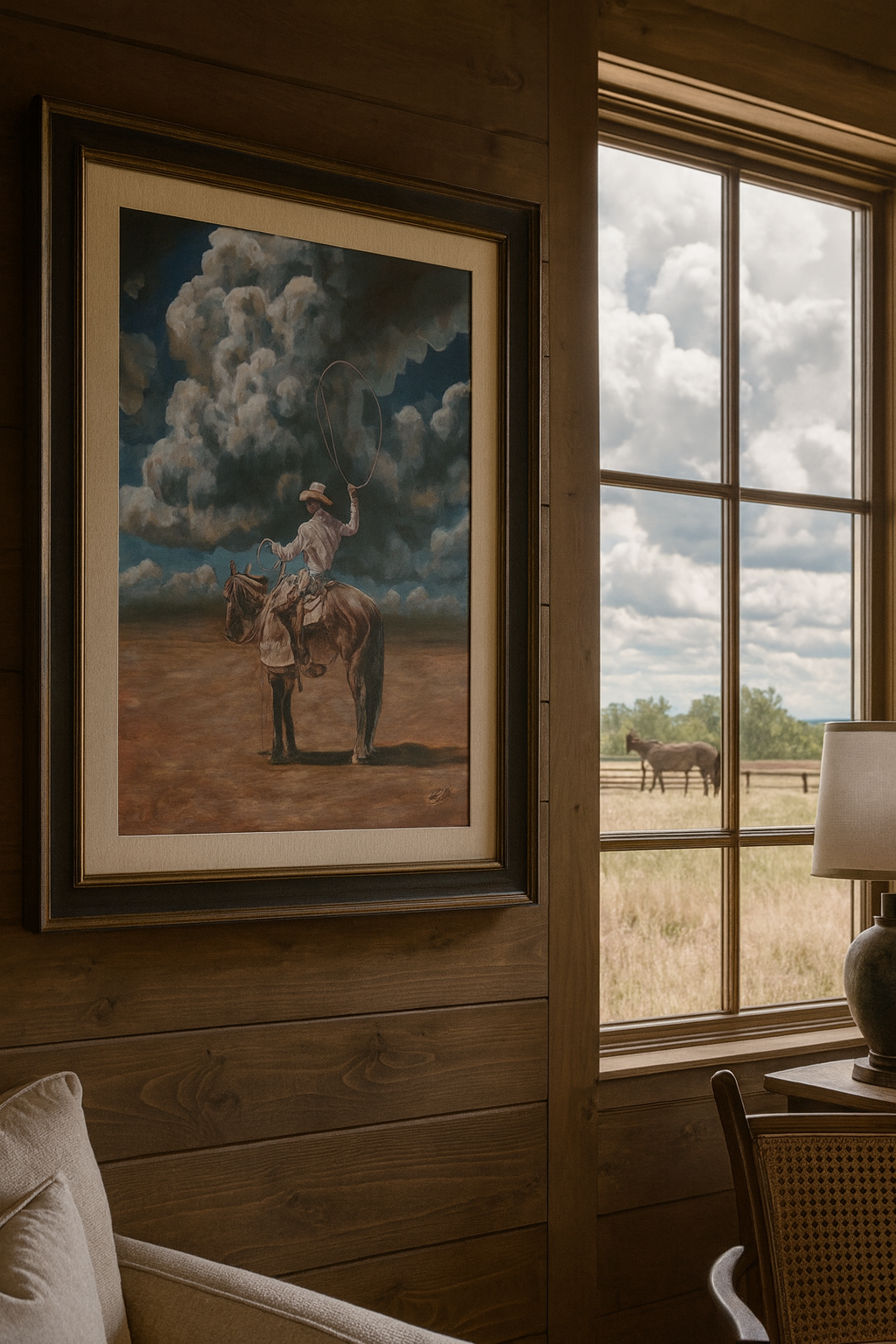 This new work was born out of my time at Painted Mesa Ranch in Arizona, where the land runs deep with history and the sky never stops reminding you who’s in charge. It’s not just a scene — it’s a reminder of the space we all live in, steady on the earth, trusting what the sky will bring.