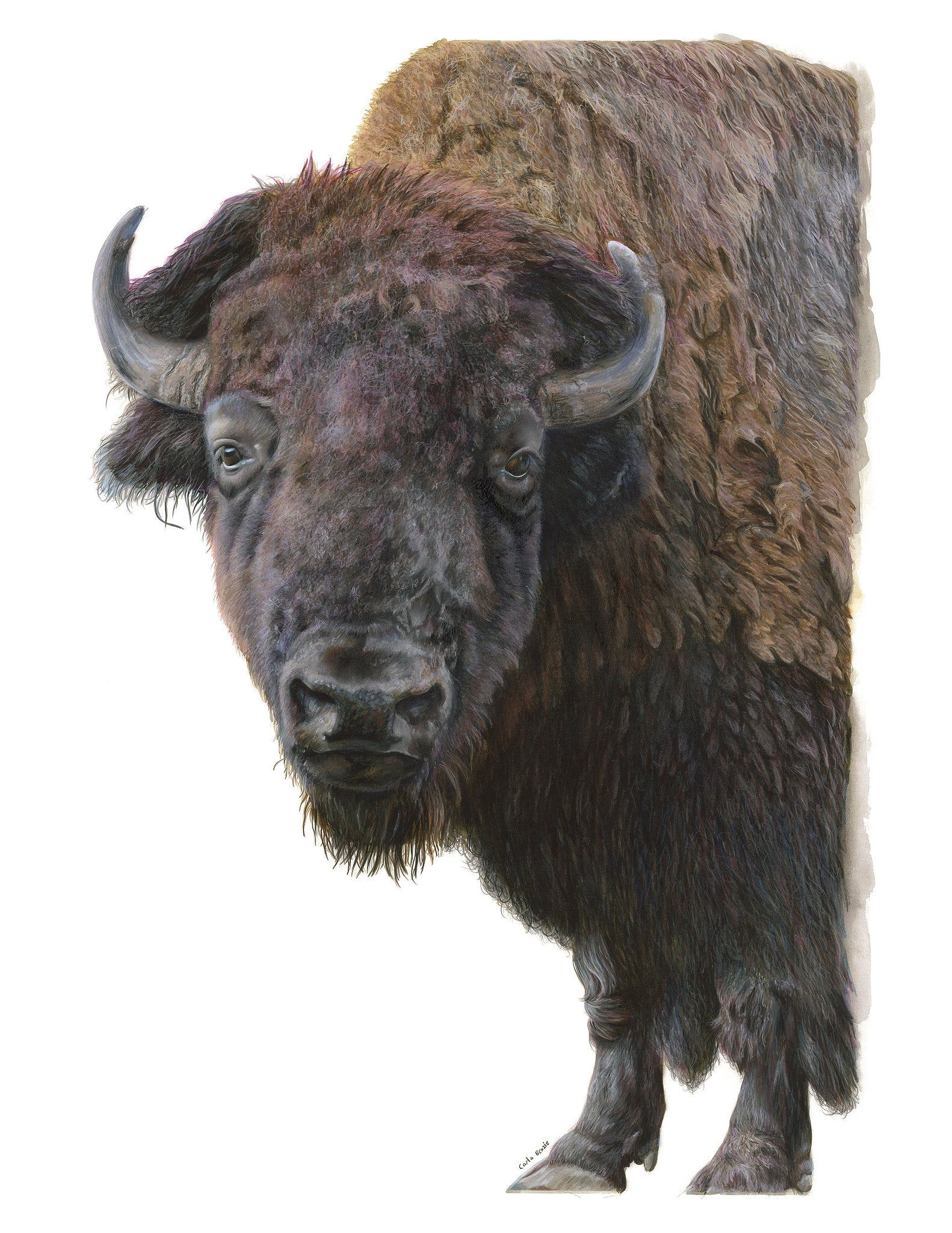 Delve into the profound depth of "Bison," a compelling close-up depiction of a bison, presented in a notably darker, more intense style. This artwork captures the raw, untamed essence of the bison, its powerful features and brooding gaze filling the frame with a palpable sense of strength and primal energy. The dark tones and deep shadows enhance the mysterious and formidable spirit of this noble creature, inviting viewers into a world of wild majesty and ancient resilience.