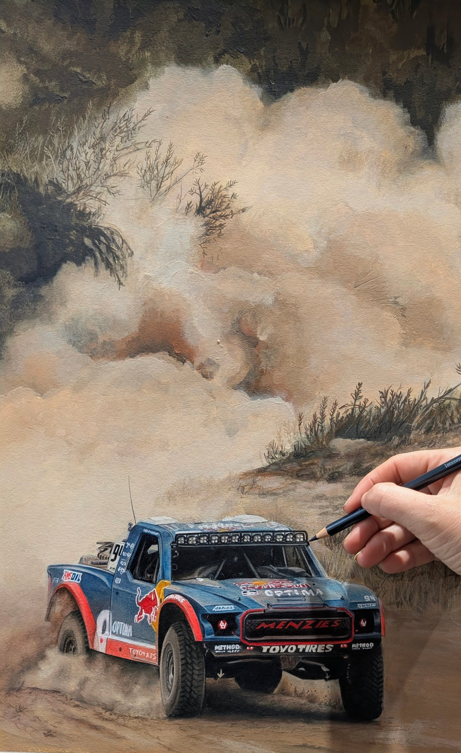 Every detail of the truck, the movement in the suspension, the weight of the dust cloud, was studied and developed by hand to capture the speed and intensity of Baja. This is not a print reproduction of a photo. It is a hand-crafted original created from standing in the desert and watching history unfold.
