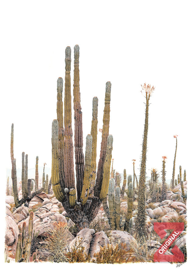 Corazón de Baja,"Valle de los Cirios, is a piece I cherished creating one morning while driving through Baja California Mexico, on our way from Bahia de Los Angeles. The thick fog enveloped the desert, creating a stunning scene of cacti peeking above distant rocks. As we navigated through valleys and hills, the fog lifted slightly, revealing some of the most beautiful cacti I've ever encountered. This area, known as the Valley of the Candles, is truly the heart of Baja.
