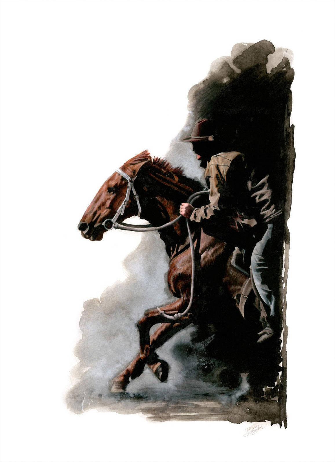 Out of the foggy darkness she rides until the first break of dawn appears on the horizon, lifting the fog.
