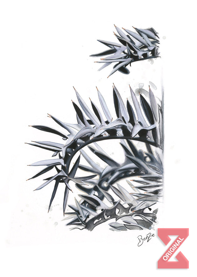 "Hermosas Espinas" is a captivating black and white pencil drawing that celebrates the stark beauty of the Baja desert.
