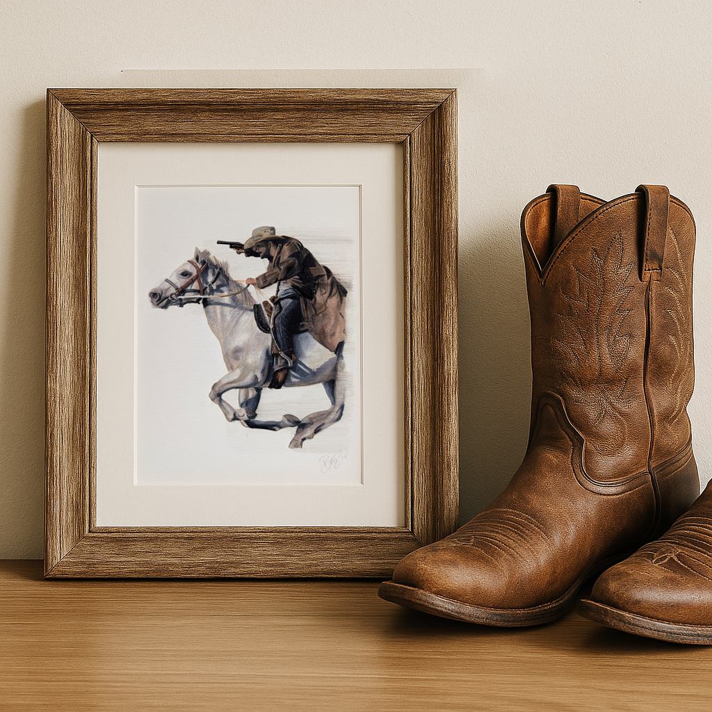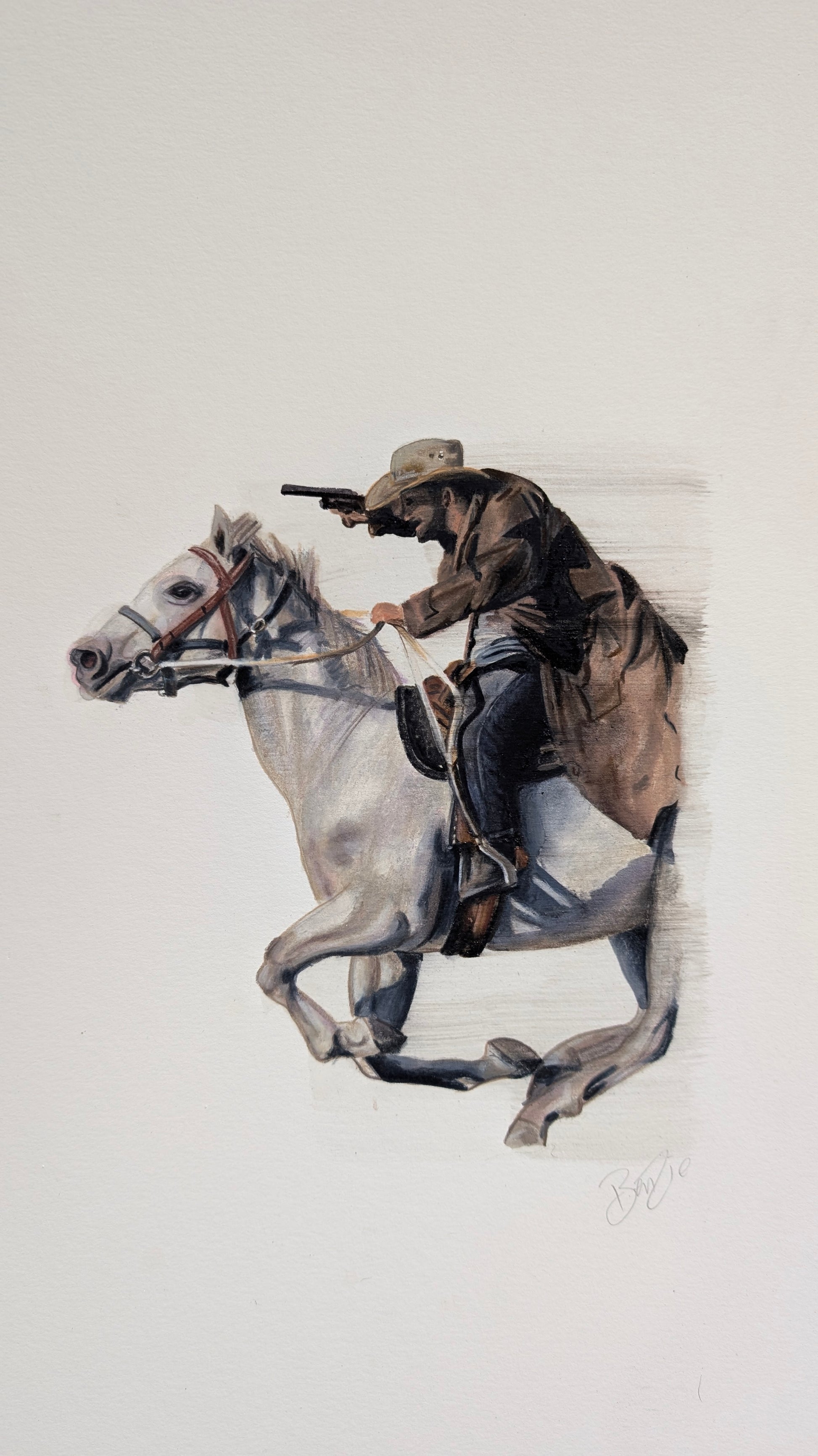He’s mid-gallop, gun raised, riding full-tilt into the unknown. No time to think. Just trust the horse beneath you and go.