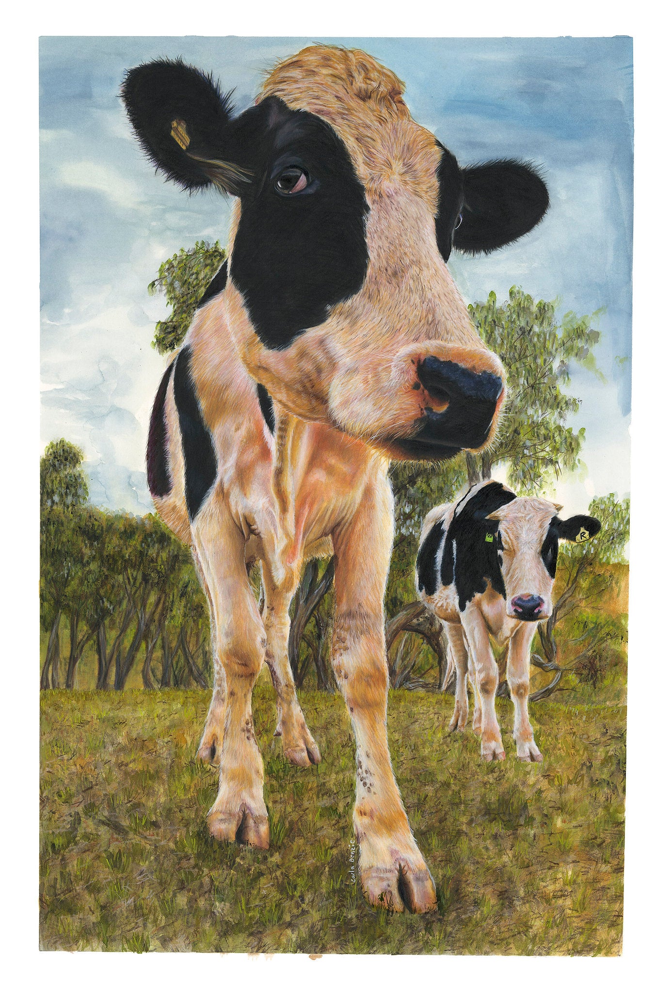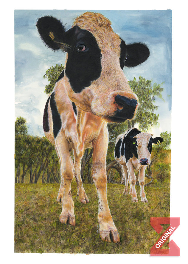 Experience the rustic elegance of "Queenie and Fehu," a captivating portrayal of two adult female cows standing with noble grace in a verdant field. Their strong, serene presence exudes a maternal majesty, symbolizing the enduring spirit of pastoral life.