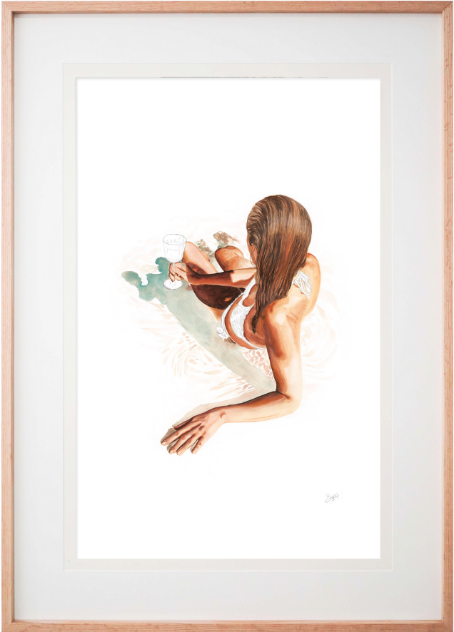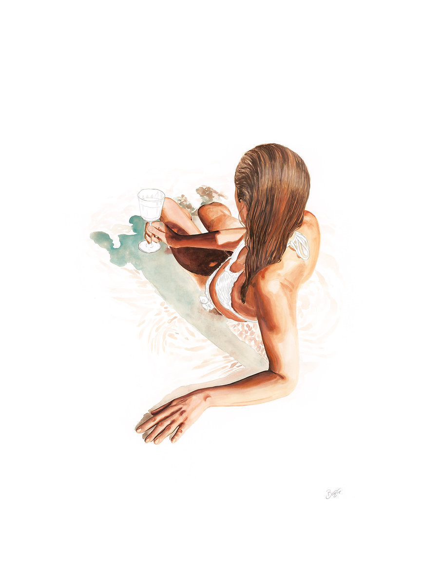 Embark on a "Seaside Sojourn" where an elegant muse savors the elixir of indulgence amidst the warmth of sun-kissed sands and gentle caress of the azure sea. French Riviera's holiday vibes come alive in this alluring masterpiece.