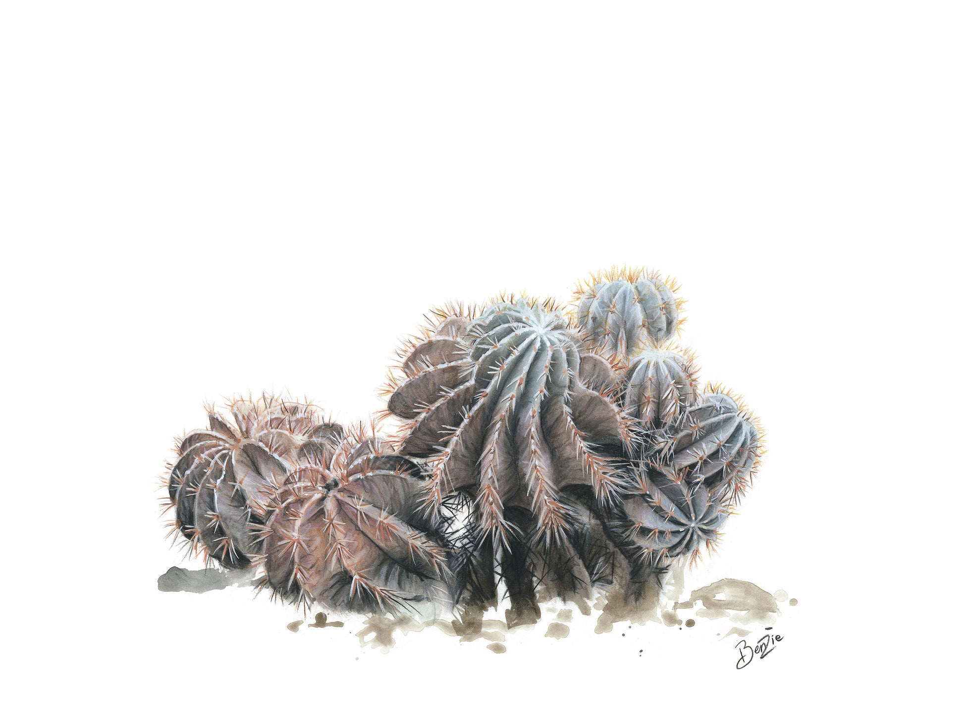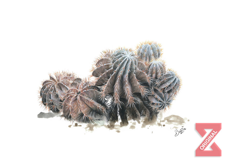 Benzie's keen eye has honed in on the plant's distinctive form, rendering its spiny protrusions and circular silhouette with a precision that borders on the hypnotic.