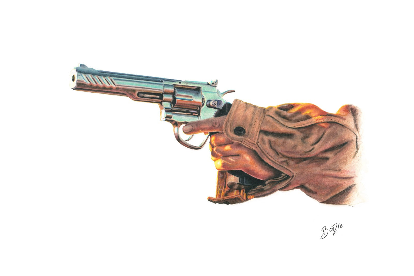 The jacket's golden brown color blended seamlessly with the earth around her, while its worn edges hinted at countless adventures. As she raised her revolver, the metallic sheen caught the light, contrasting sharply with the warm tones of the landscape.