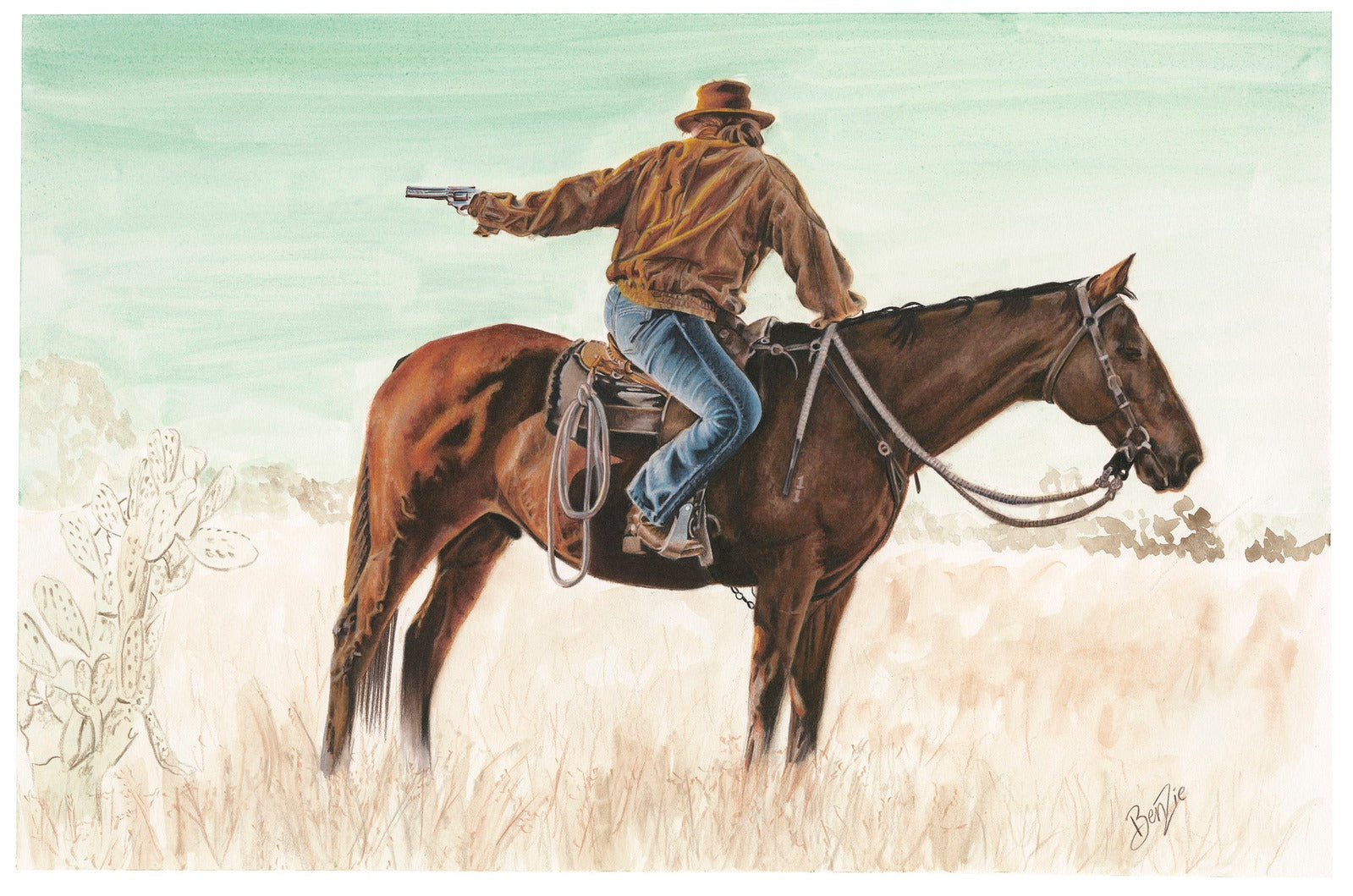 Across from him, a woman sat confidently atop a sleek brown horse, her dark hair cascading over her shoulders. Her eyes sparkled with determination, and her own revolver was aimed steadily at Jake.