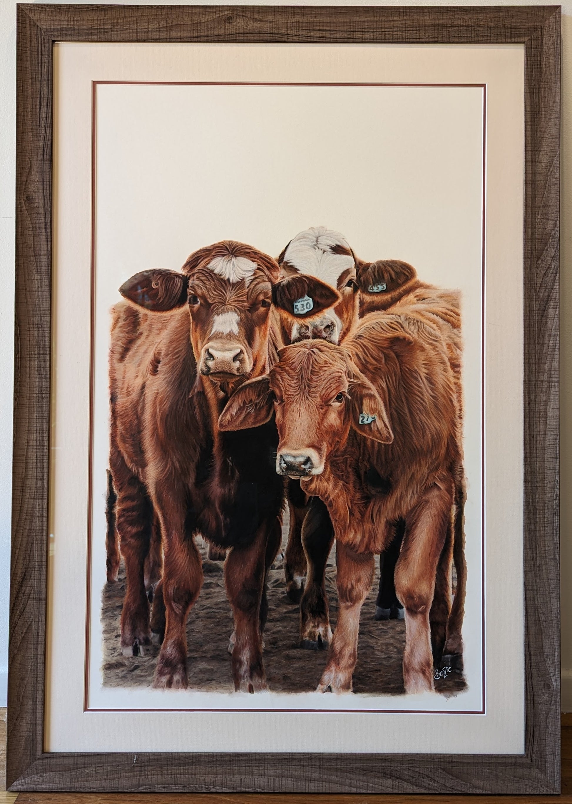 "The Curious Three" charmingly captures a trio of brown calves huddled together, embodying the essence of innocence, curiosity, and closeness. Their youthful eyes reflect a world of wonder and discovery, as they explore their surroundings with an endearing sense of togetherness. The composition emphasizes their shared bond, with each calf leaning into the other, symbolizing the unity and comfort found in companionship. This artwork tenderly portrays the gentle nature of these young animals, inviting viewers to connect with the simple, heartwarming moments in the animal kingdom.