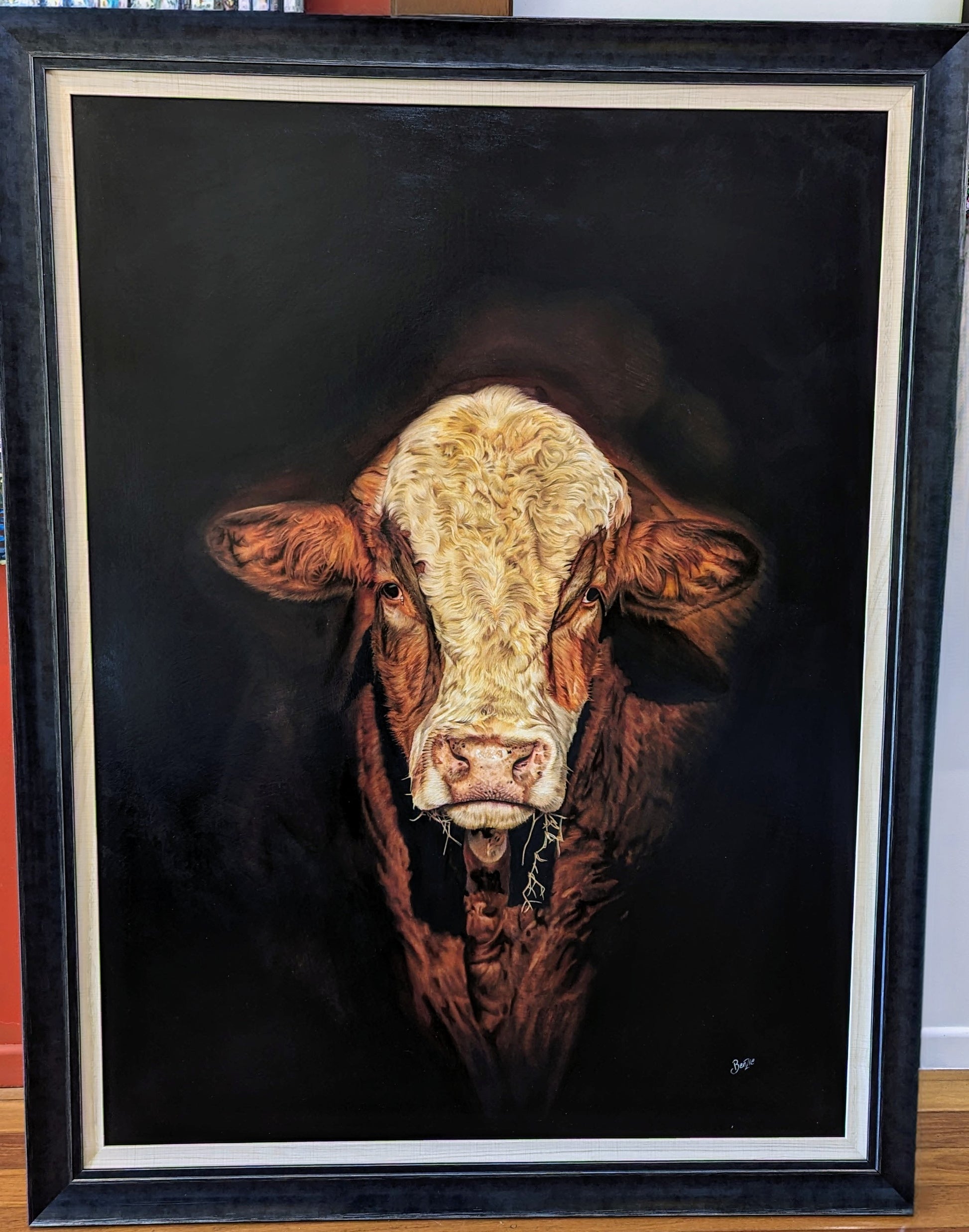 "The Maker" is an engaging portrait of a brown cow, presented front-on against a stark black backdrop. Captured in the midst of grazing, this artwork elegantly juxtaposes the simple, everyday act of eating grass with a deep, absorbing background. The cow's earthy brown hues stand out vividly against the darkness, drawing attention to the animal's peaceful expression and the gentle, rhythmic motion of grazing. This piece offers a contemplative view on the natural cycle of life, highlighting the cow's role in the pastoral landscape, symbolized through its basic yet essential act of sustenance.