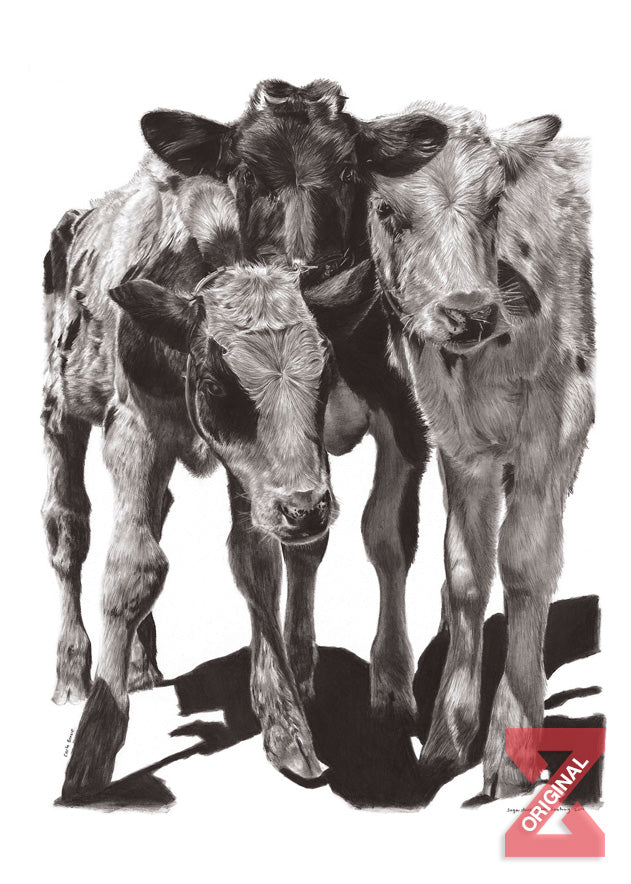 "Three Brothers" is an evocative black and white piece that portrays three older calfs. These mature calfs are captured in a moment that reflects a deep, enduring bond shaped by time. The monochromatic tones lend the artwork a timeless quality, emphasizing the textures and contours of their faces and the subtle interplay of light and shadow. This composition highlights their shared history and the unspoken understanding between them, offering a glimpse into the complex social dynamics and the quiet strength present in these noble creatures.